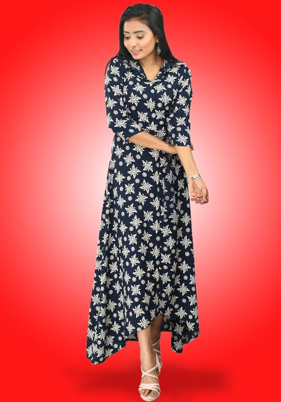 Polka Designed Cross Over Maxi Dress with Three Quarter Sleeves