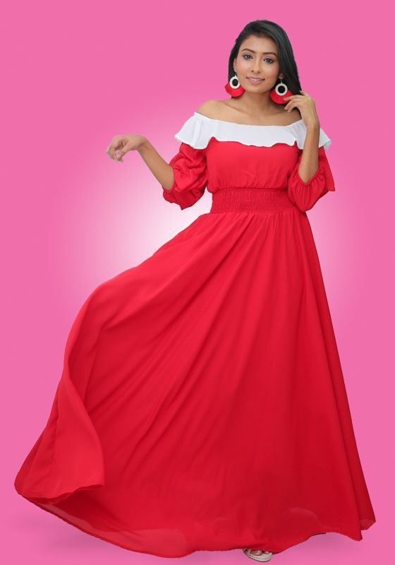 Off Shoulder Frilled Georgette Maxi Dress with Gathered Waist