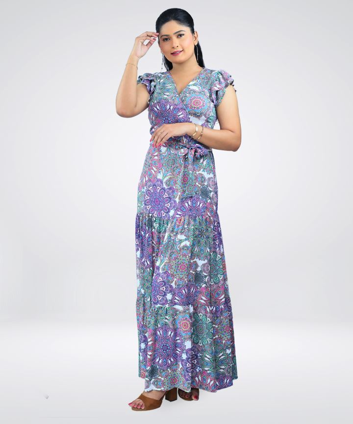 Floral Flared Maxi Dress with Flared Short Sleeves