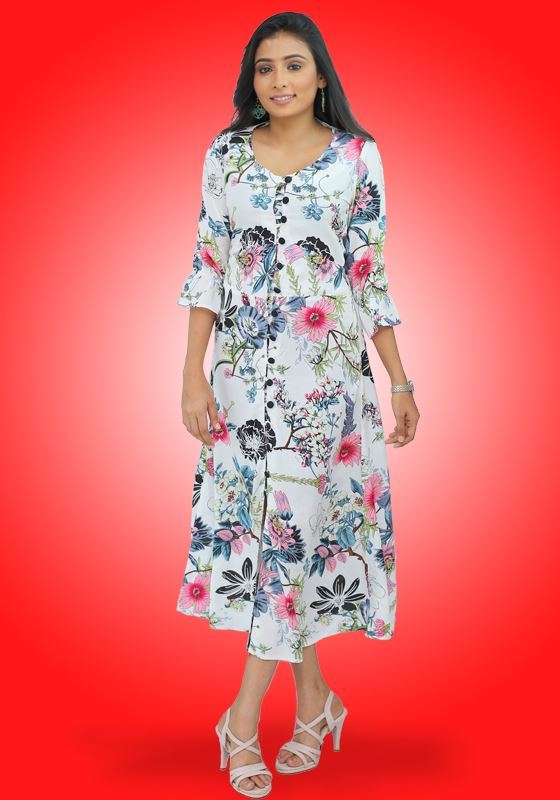 Round Necked Printed Flower Designed Three Quarter Frock with Puff Sleeves
