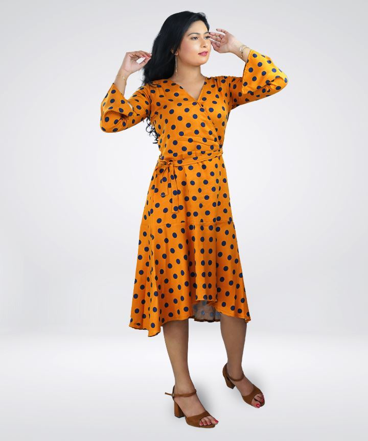 Three-quarter Sleeves Side Knot Wrap Around Dress