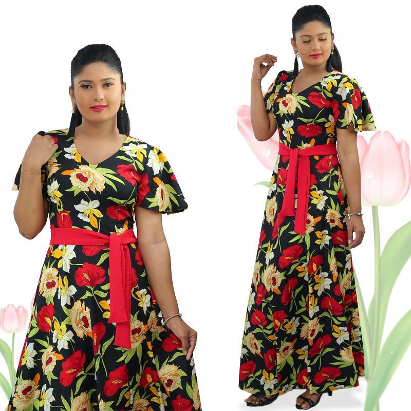 V-necked Floral Maxi Dress with Belt