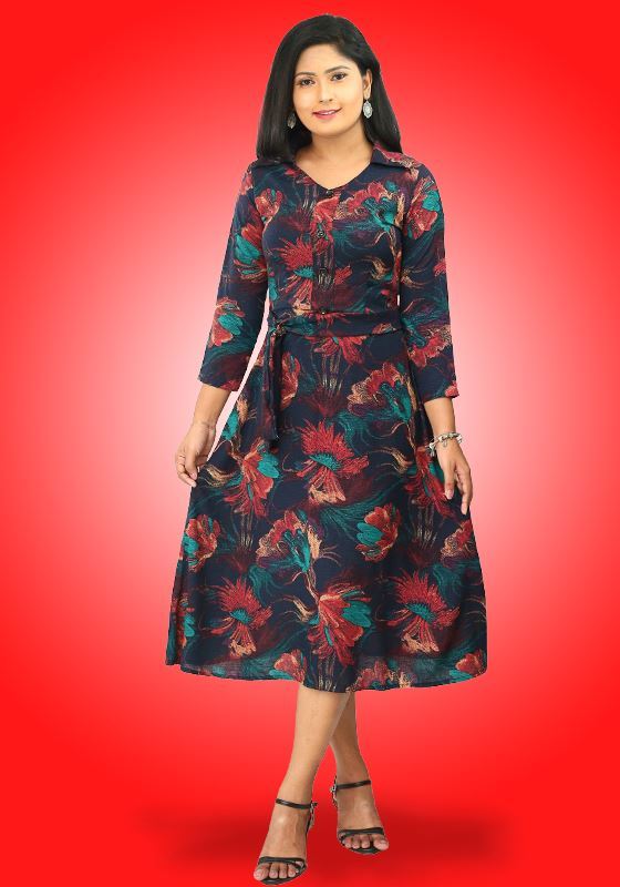 V-necked Printed Designed Three Quarter Frock with Collar